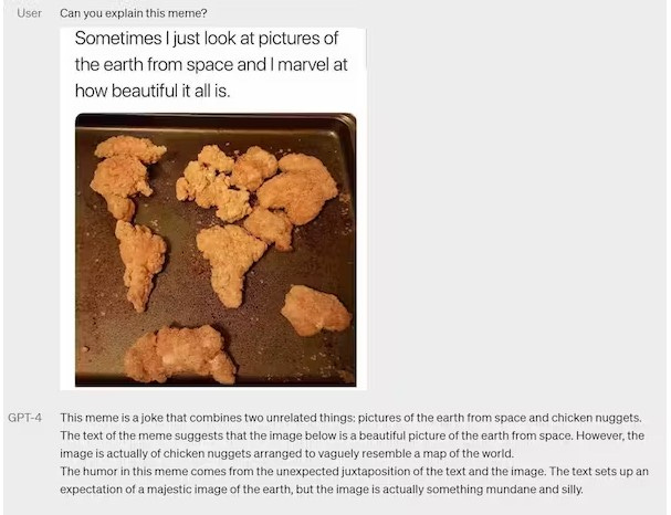 GPT-4’s release in March of this year arguably marked another huge step towards AGI. The release was accompanied by a technical report that summarized GPT-4’s impressive, state-of-the-art performance on AI benchmark tests and traditional college exams. Additionally, as seen below, GPT-4 can accept visual input prompts and describe objects, nuances, and underlying meanings in images.