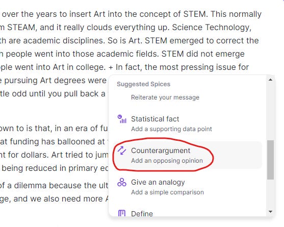 There are other resources that are helpful like Perplexity.ai which has good source material but works better when fed prompts refined by ChatGPT. Also, tools such as WordTune and their ‘spices’ actually allow you to add data, analogies, and other tools to help bolster writing and expand that Polymathic Mindset such as the ability to create a counterargument.