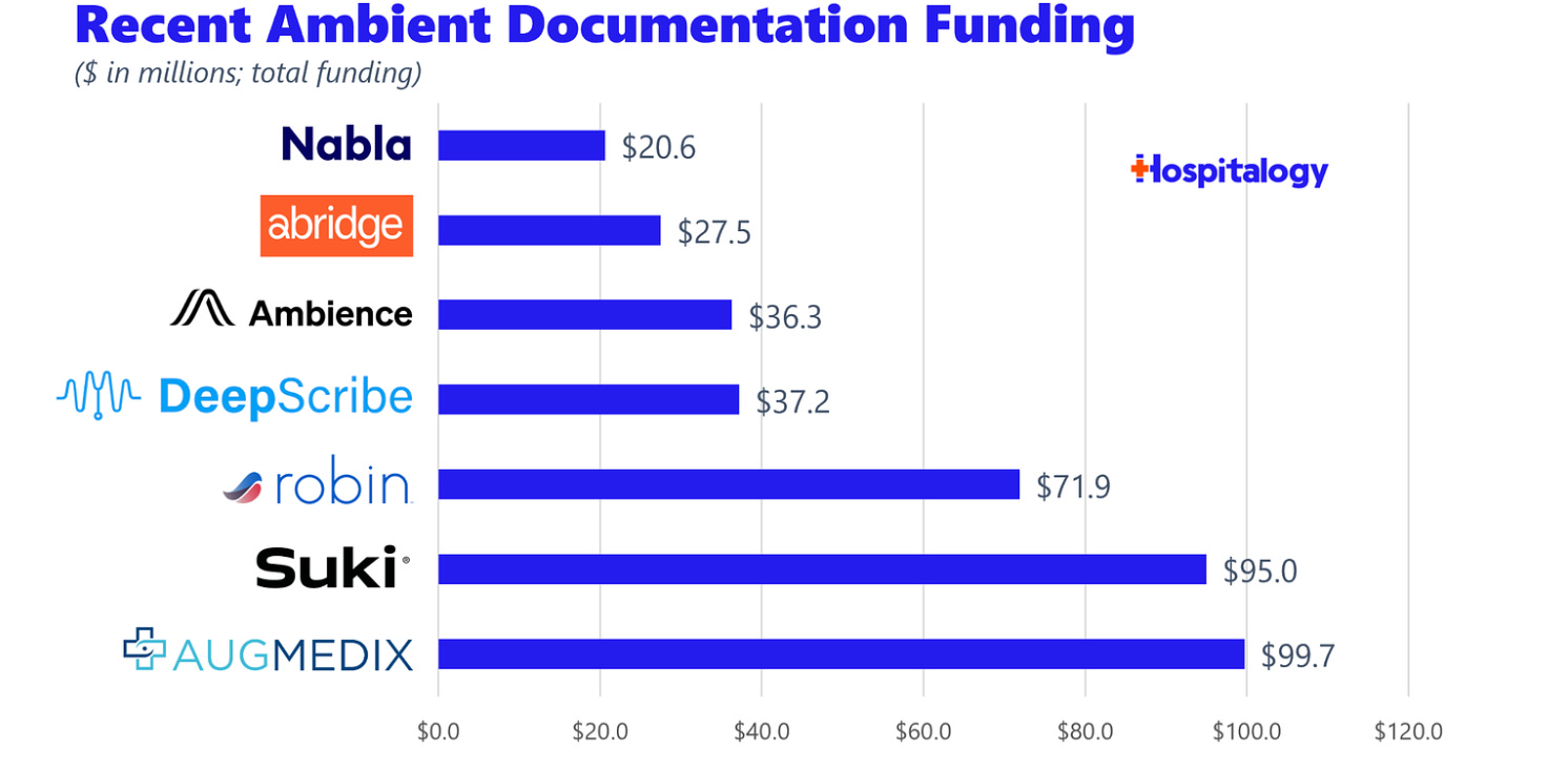 A variety of companies offer AI scribe services, including some big players like Augmedix and Nuance. They’ve been raising money steadily and the race is on to see who will win major market share: