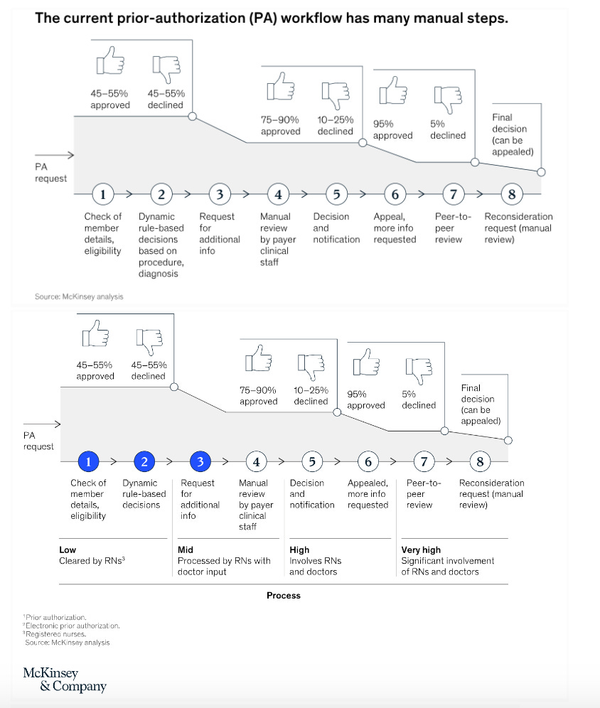 Of course, insurers are also using AI to streamline their workflows, as this McKinsey graphic demonstrates. The concept of taking humans out of the loop for the processes that rely on humans just looking up straightforward information like eligibility makes a lot of sense.