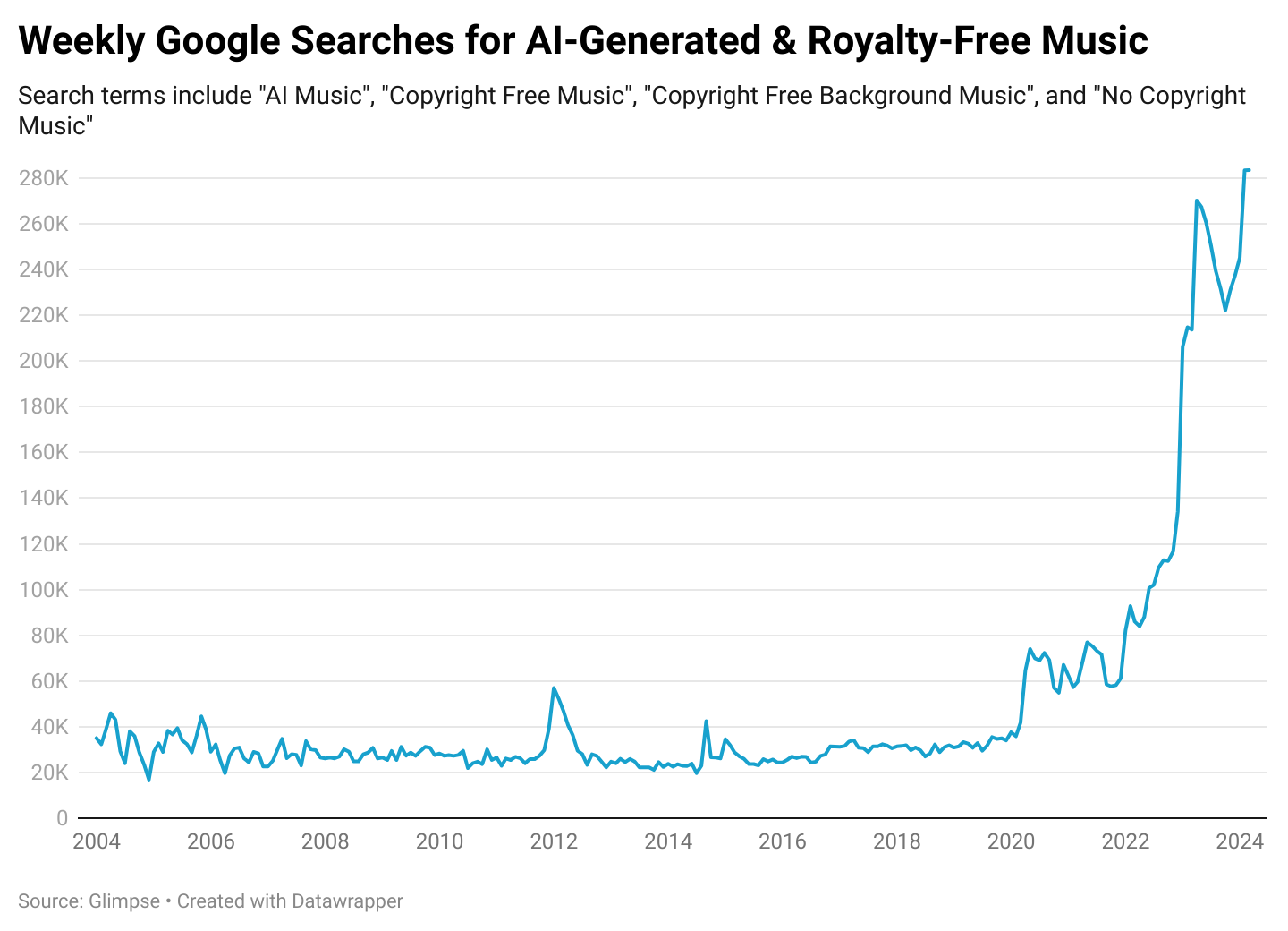 According to Glimpse, a trends discovery tool, two of the fast growing music-related search terms are various phrasings of “AI music” and “copyright free music”. In the same way that AI technology will transform how producers generate the short loops that they use to make songs, AI technology will also transform how we create entire recordings. When I say “recordings,” I don’t mean those that you hear on your favorite pop radio station, at least not in the short term. I mean those that you hear when you aren’t paying much attention.
