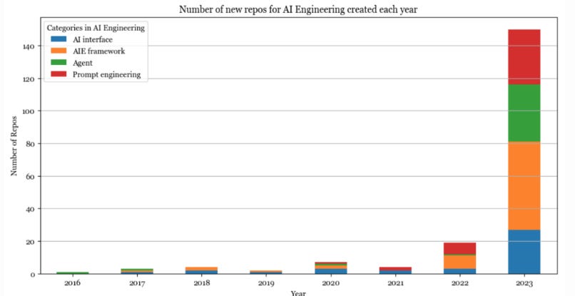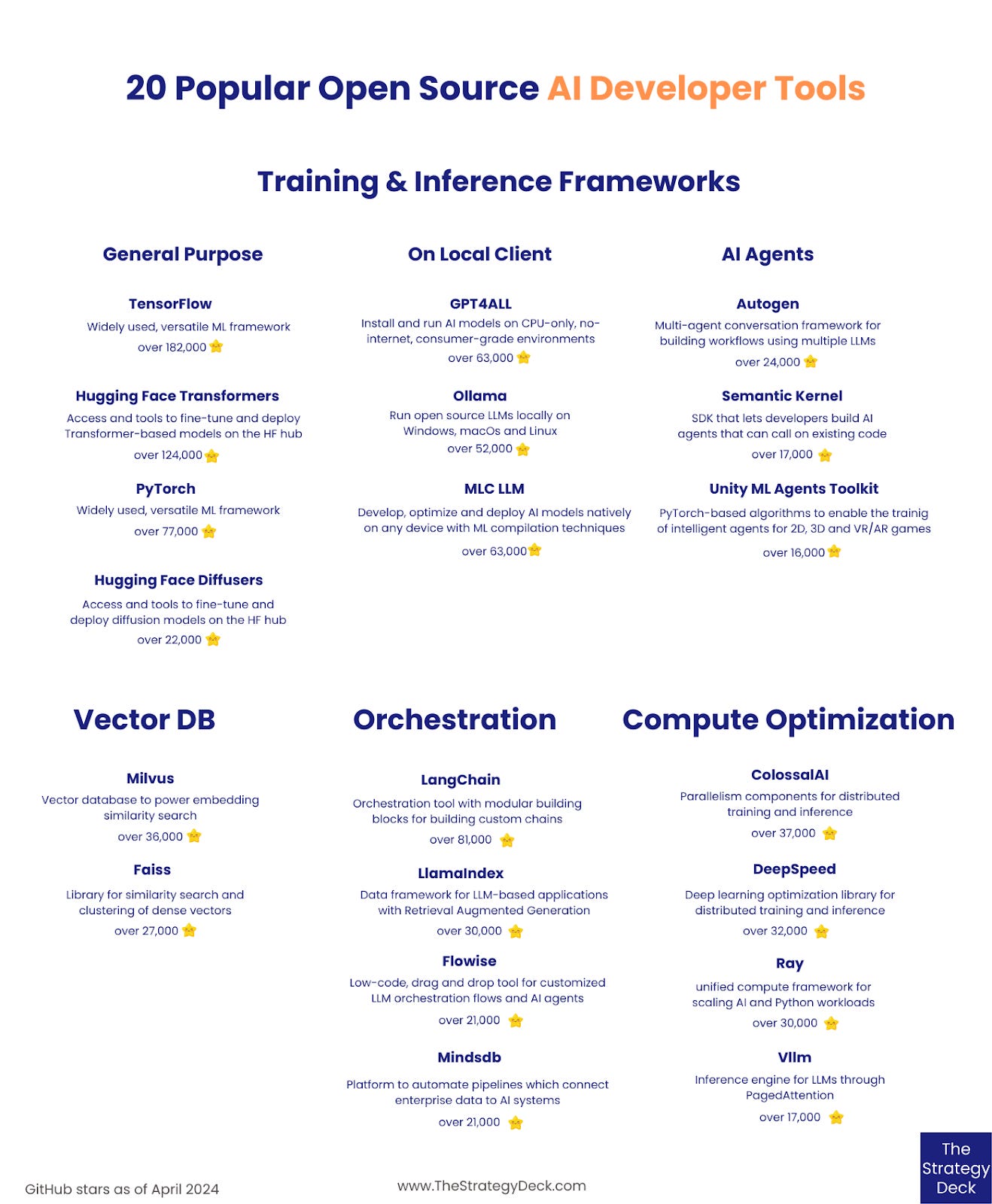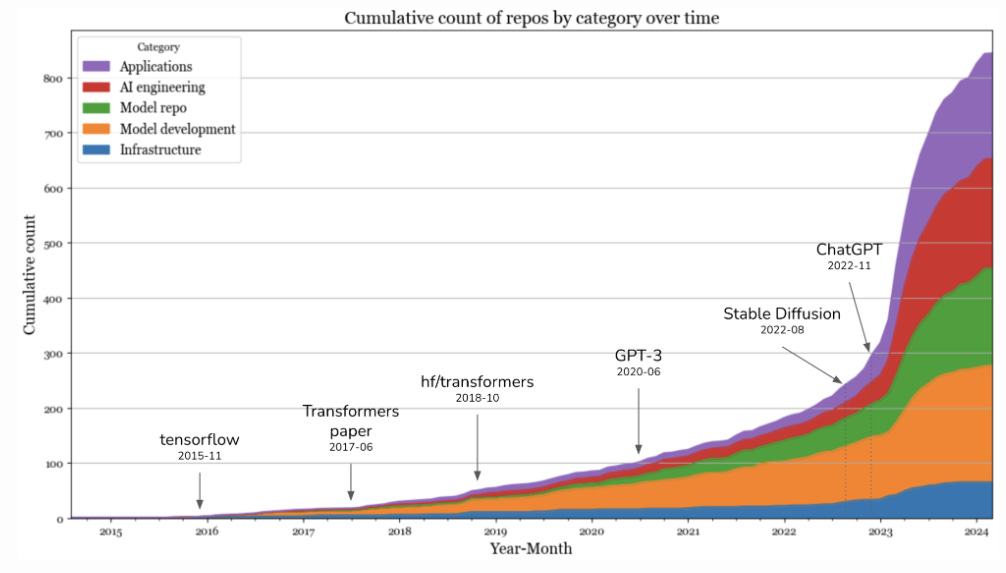 In March, 2024 Chip Huyen wrote a blog post titled: “What I learned from looking at 900 most popular open source AI tools”.