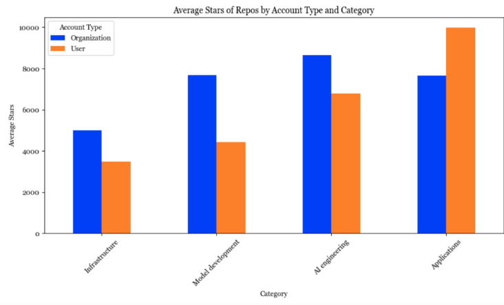 Chip noticed that applications started by individuals, on average, have gained more stars than applications started by organizations.