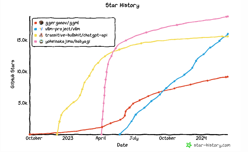 With all of this building we also see an incredible among of trends, churn and temporary spikes in usage and stars (i.e. developer discovery). In 2022 to 2025 we are still in the ‘hype curve’ of Generative AI’s nascent first years.