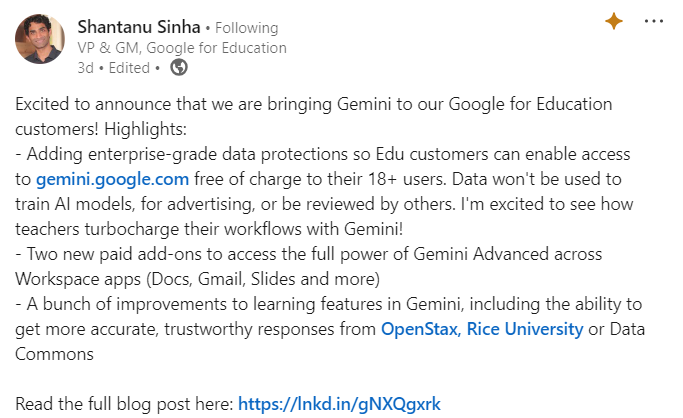 Over the weekend, Shantanu Sinha, VP & GM at Google for Education, announced on LinkedIn the rollout of Gemini for Google for Education customers.