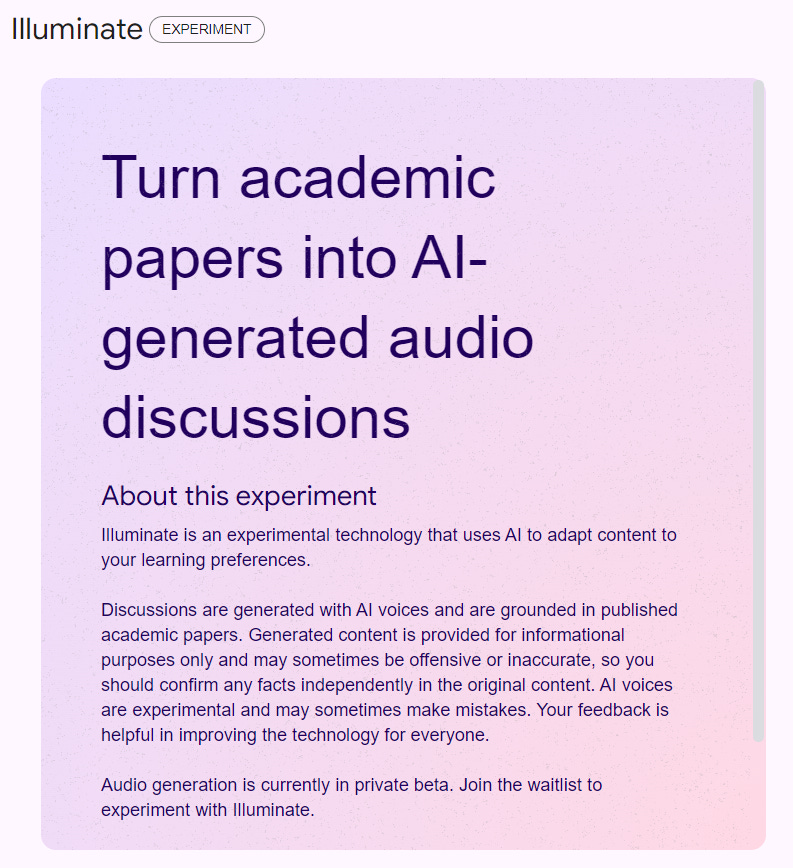 Participation: To access existing audio summaries or join the waitlist for creating your own, visit Labs.google.