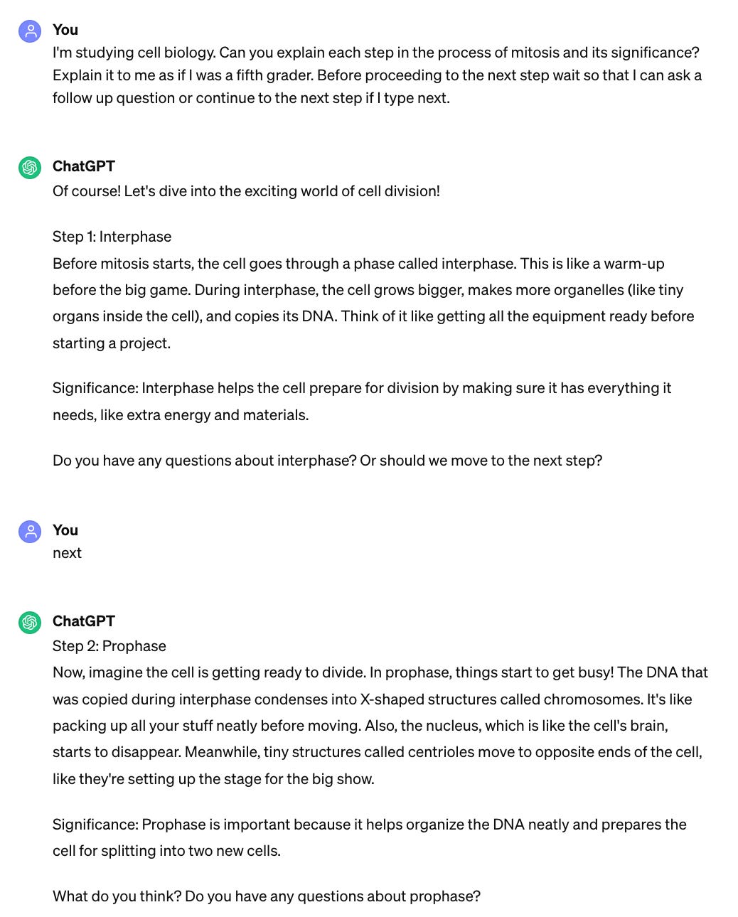 Whether it’s 3AM before an upcoming final or 6PM finishing up a homework assignment, generative AI tools are available 24/7 to explain any concepts, proofread your writing, or assist with homework assignments. It’s like having access to a free, on-demand, personalized tutor at any hour. AI tools can tailor their explanations to each student’s level of understanding, learning style, and areas of confusion. This allows students to confidently explore concepts, clarify doubts, and deepen their knowledge without the fear of judgment or the frustration of unhelpful responses from a teacher. Here is an example of how students may utilize AI tools like ChatGPT to understand a new concept, such as the topic of mitosis in a biology class: