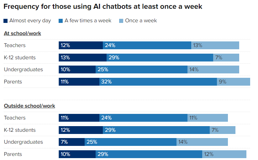 This means teachers and professors are using Generative AI nearly as much as the students are. This surprised me. If we are to believe the survey, Seventy percent of K-12 students had a favorable view of AI chatbots. Among undergraduates, that rises to 75%. And among parents, 68% held favorable views of AI chatbots.