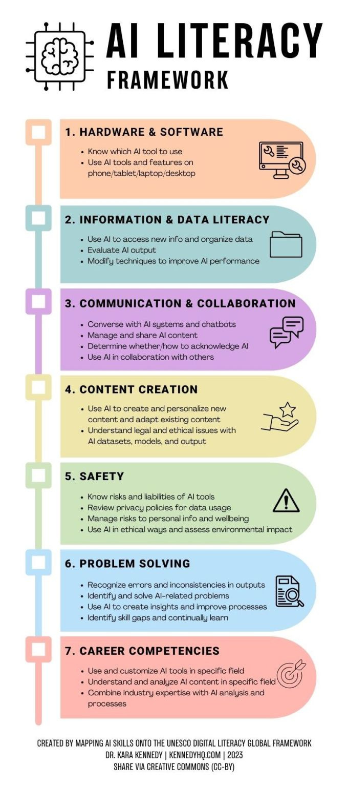 Developing AI literacy – an understanding of how these tools work, their potential impacts, and ethical considerations – will be crucial moving forward. Without proper guidance, the ease of generating content through AI could promote plagiarism, misinformation, or other unintended consequences. Educators and students alike must prioritize developing AI literacy alongside the adoption of these powerful technologies. The AI literacy framework developed by Dr. Kara Kennedy offers a helpful guide on how we can approach AI literacy across various contexts such as communication, collaboration, content creation, and more.