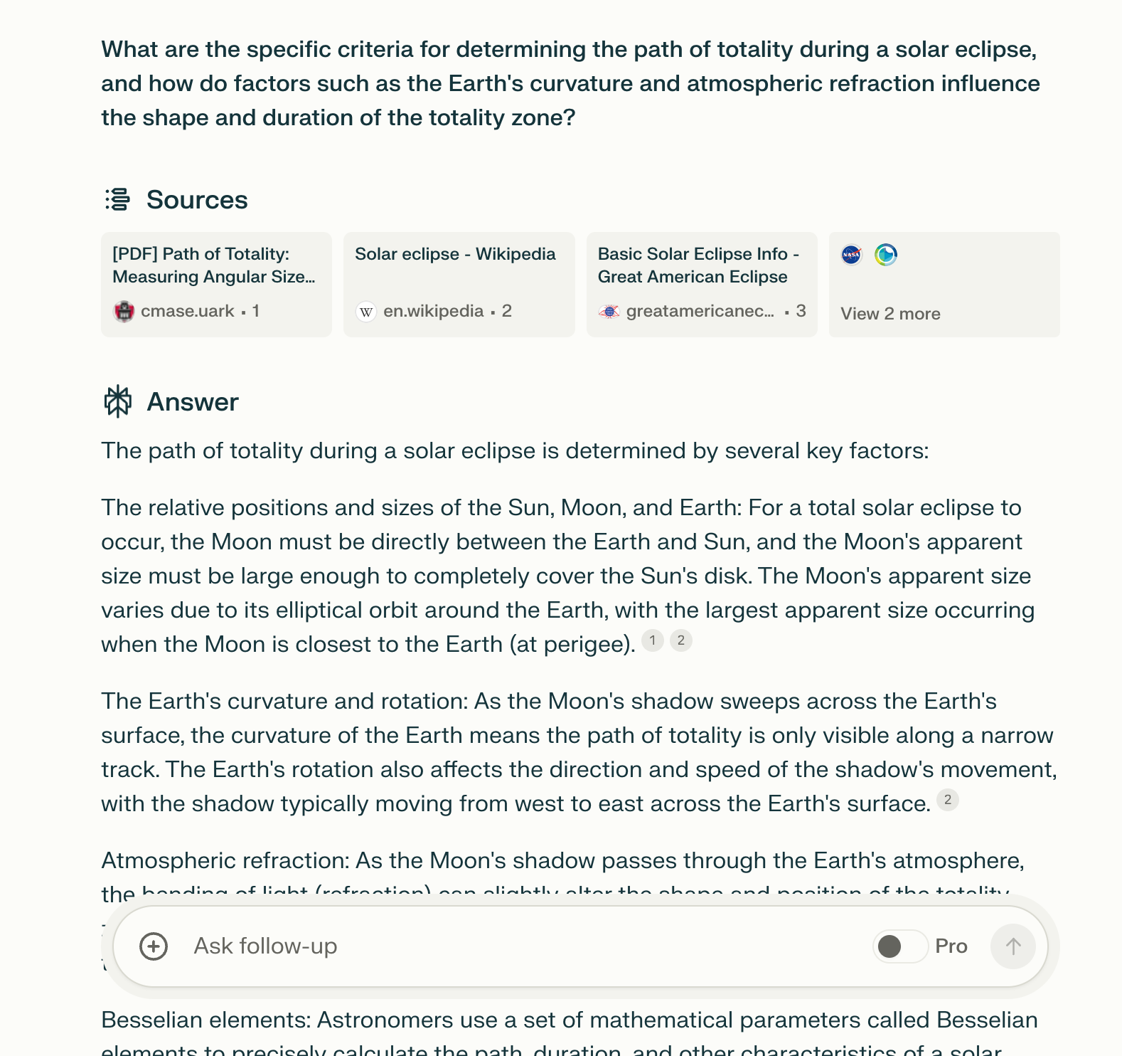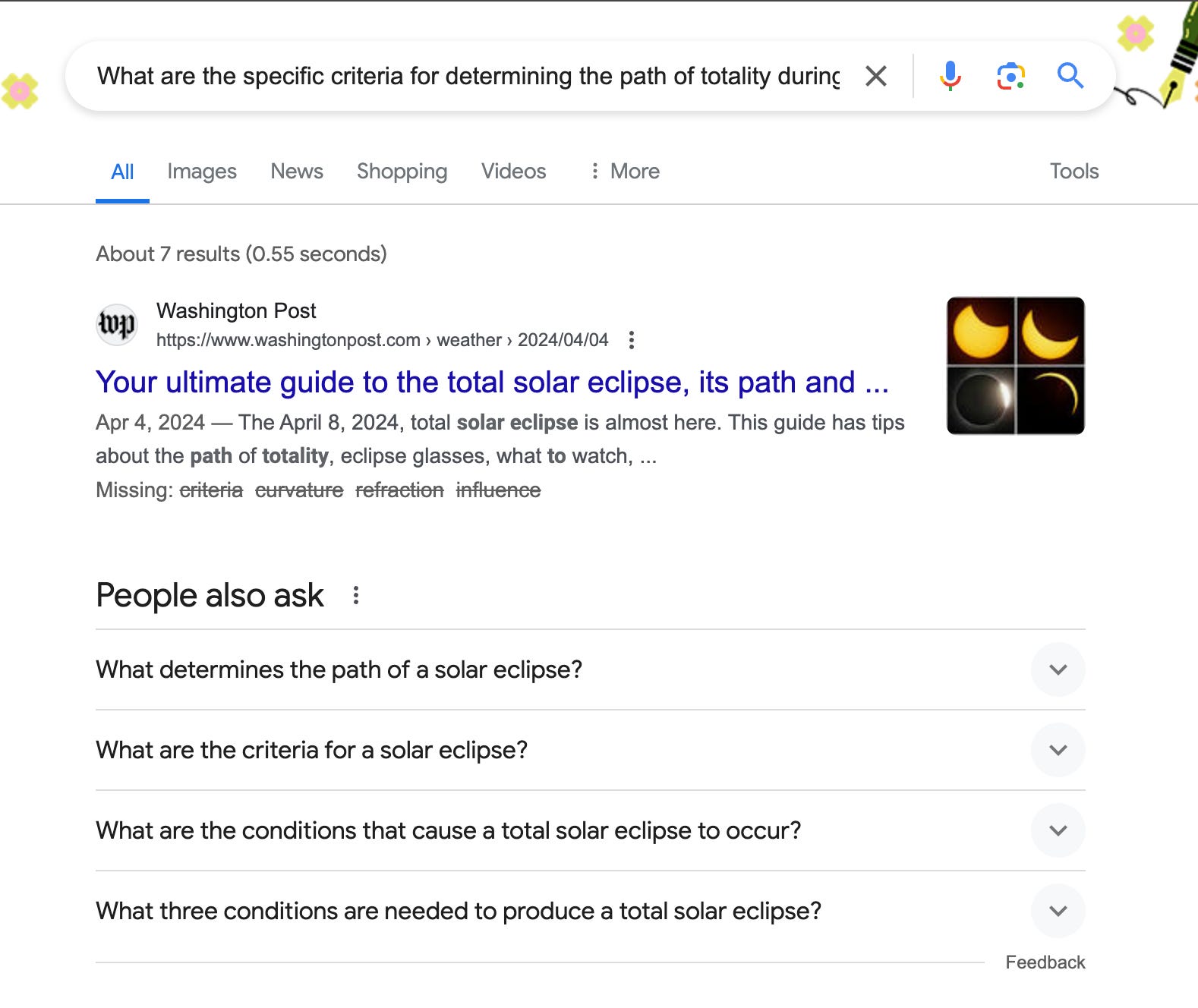 To show this in action, I asked Google, “What are the specific criteria for determining the path of totality during a solar eclipse, and how do factors such as the Earth’s curvature and atmospheric refraction influence the shape and duration of the totality zone?” Despite the specificity of this question, most of the results referenced broad discussions of what a solar eclipse is without actually answering the question.
