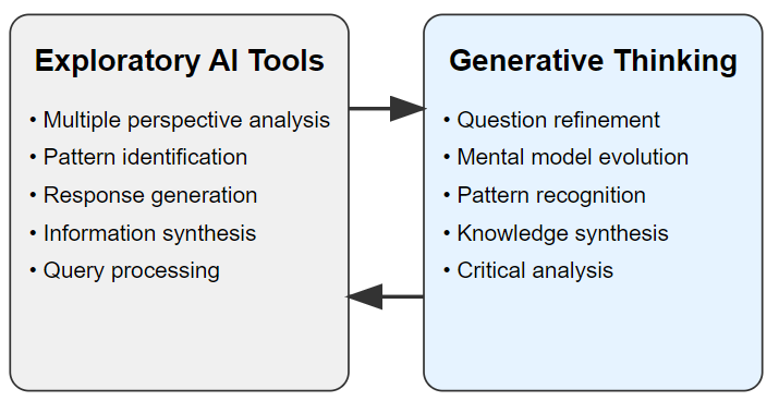 At its core, this bi-directional dance between exploratory AI and generative thinking involves several key cognitive moves, and watching them unfold in real time is electrifying. Students learn to frame and reframe questions, approaching their subject matter from multiple angles simultaneously. They develop what some call “prompt literacy”—the ability to craft queries that open up possibilities rather than narrow them down. But more importantly, they learn to identify patterns and contradictions across AI responses, developing a meta-analytical skill that transcends any single interaction.