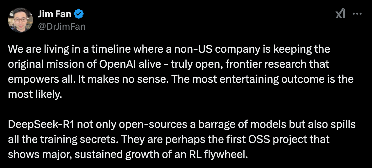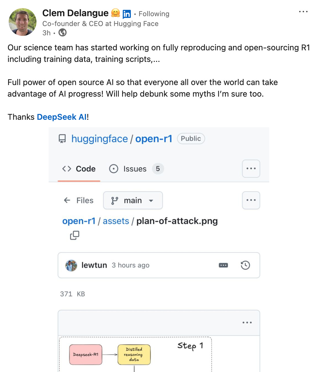 Heās right. For closed source AI, R1 must be a rude awakening. Being free to download, businesses can fine-tune and run the model privately at minimal cost (this is already happening). And companies like Hugging Face have started reverse-engineering it.