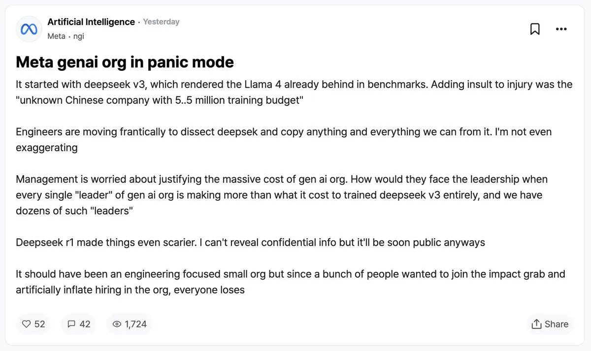 The team and limited resources R1 was trained with have tech CEOs scratching their heads. On Blind, a platform for tech workers to anonymously share stories, a post that gained a lot of traction seemed to suggest that Meta is in crisis mode as it scrambles to understand how DeepSeek outpaced their own efforts in open source AI: