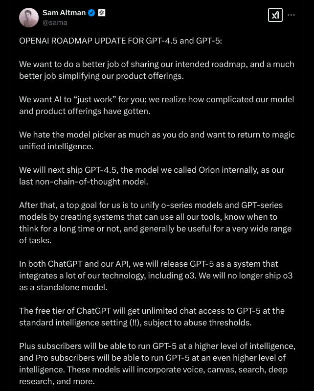 🗺️ Altman announces GPT-5 roadmap, cancels o3 launch