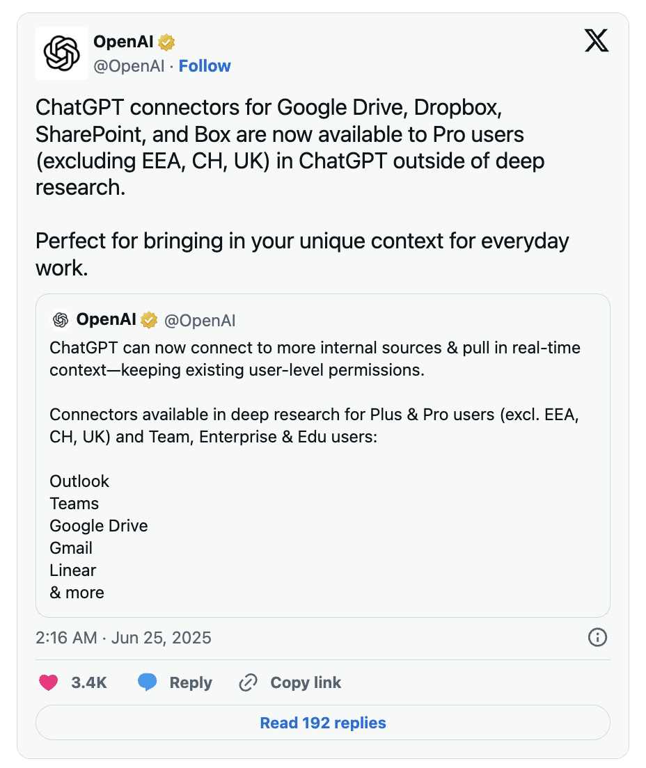 ๐ฅ ChatGPT plugs straight into your files โ OpenAI rolled out native connectors for Google Drive, Dropbox, SharePoint and Box to all Pro users, so you can search, pull and cite cloud docs without leaving the chat (continue reading)