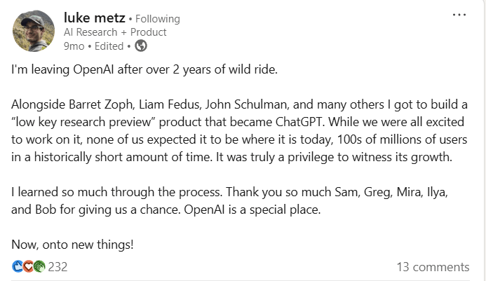 OpenAI must have been an incredible atmosphere to work in those early days that are now long gone and starting something new is perfect for some of these AI researchers who really want to do good engineering and science with the right alignment, where commercial impulses don’t come in the way of integrity.