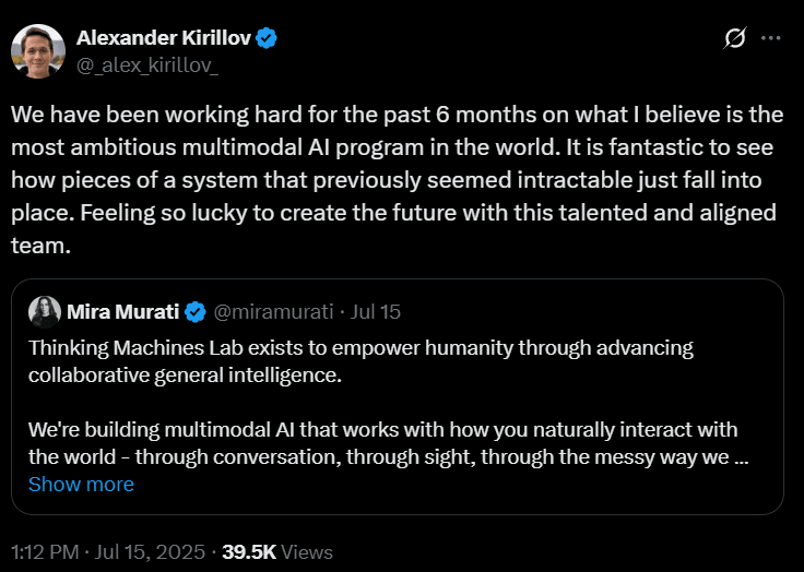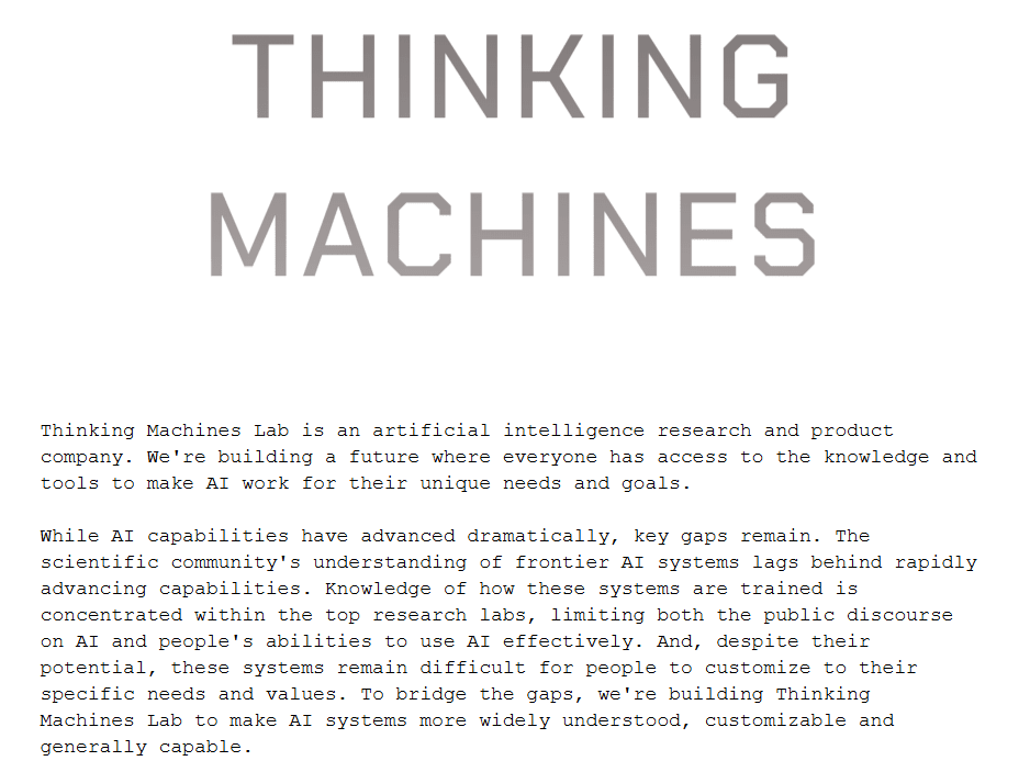 Thinking Machines Lab isn’t just a new start, it’s the opportunity to build a new paradigm and pioneer the next architecture of what LLMs can become in the real world. Not just as a hype machine of selling ultra compliant token-mirror neurons, but something a bit more tangible and close to our senses and our common humanity.