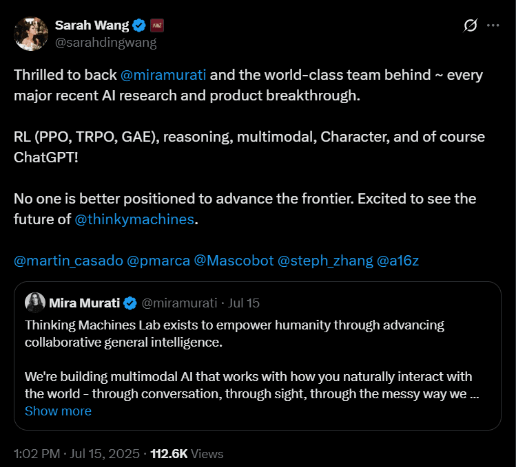 We might be on the cusp of new architectures that don’t just leverage the transformer architecture but take a more holistic and integrated approach. I’m optimistic about Thinking Machines Lab because the AI talent concentration is going to very unique and some of the best minds in the world will be attracted to work there.