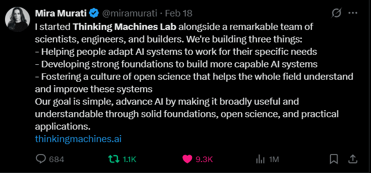 My thesis after looking into it that Mira Murati will help Thinky win on AI talent.