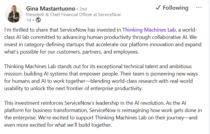 ServiceNow: A cloud-based platform provider specializing in enterprise workflow automation and IT service management. Its investment in Thinking Machines Lab aligns with its focus on integrating AI to enhance enterprise productivity and digital transformation.