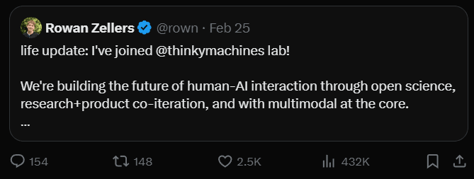 The quality of the AI talent at Thinking Machines Lab is likely to exceed that of Google Deepmind or OpenAI, only approached by Anthropic. Because we are living in the OpenAI mafia era where splinter projects become more attractive both for doing pioneering work and for the financial incentives.