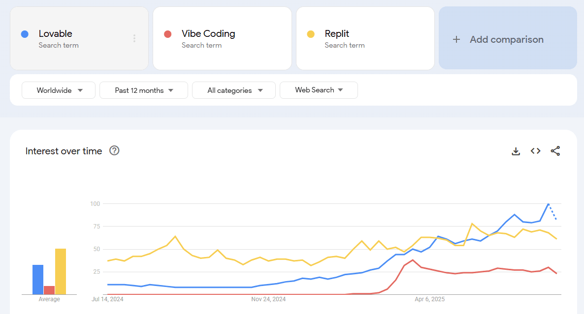 Google Trends (last year) terms Replit (Yellow), Vibe Coding (Red) and Lovable (Blue).