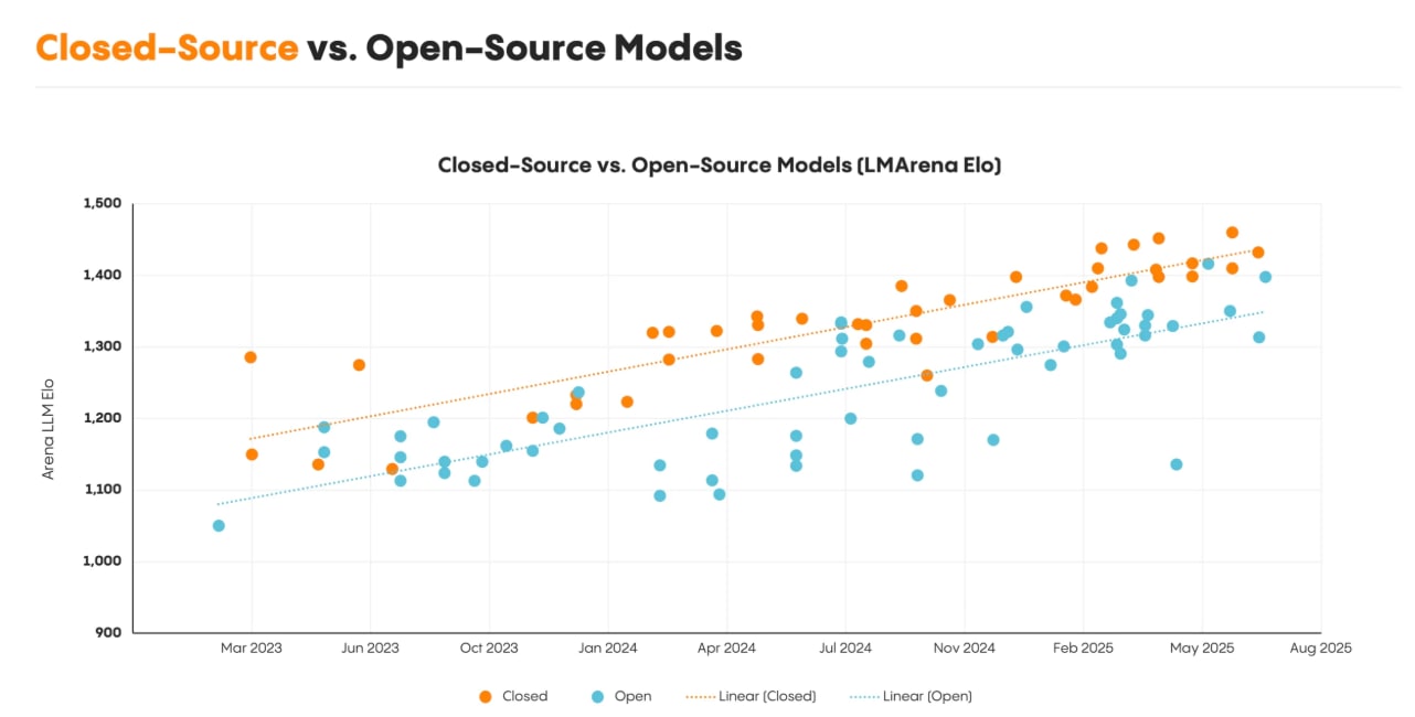 Menlo notes that the landscape has stayed active, with notable launches from DeepSeek (V3, R1), Bytedance Seed (Doubao), Minimax (Text 1), Alibaba (Qwen 3), Moonshot AI (Kimi K2), and Z AI (GLM 4.5) in the last six months. You can try all of these in one API on OpenRouter*.