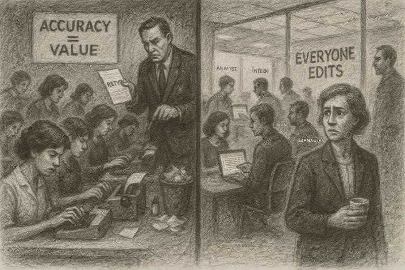 Consider what happened to typists in the late twentieth century. Before the advent of word processors, workflows were designed around typists. Entire teams coordinated with typing pools. Errors were expensive and required retyping entire documents. Formatting had to be done within the physical limitations of the typewriter. The typistās role was structured around managing these constraints.