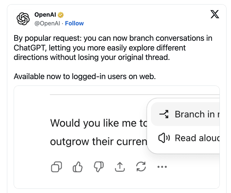 πΏ ChatGPT adds branching – Explore multiple directions in a single chat with OpenAIβs new branching feature. (continue reading)