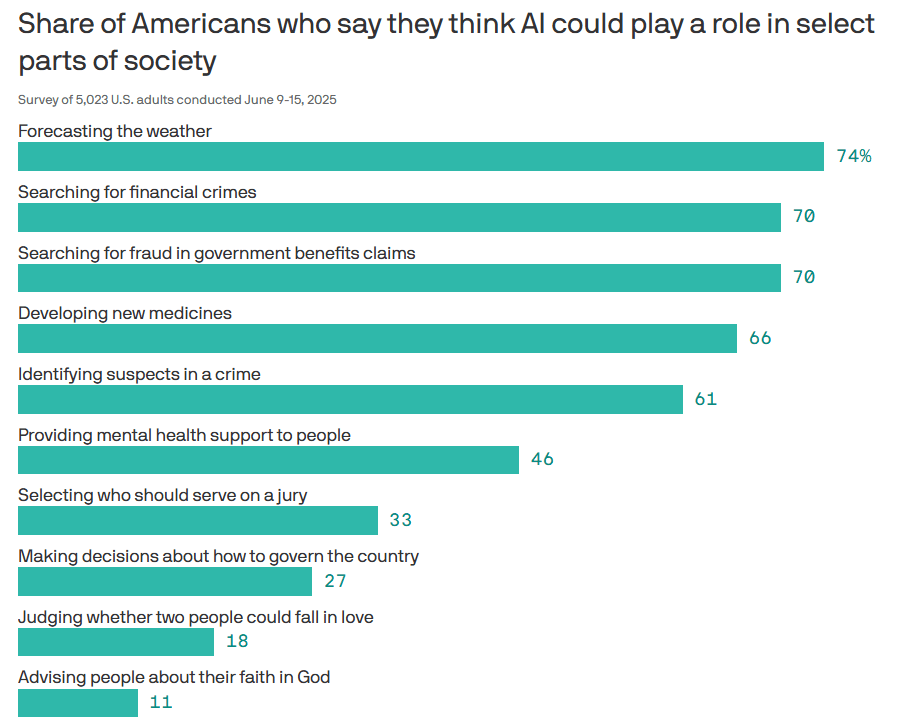 Americans are comfortable with AI being benefactors and not meddling too much. They dislike any interference in their freedoms, sense of control and livelihood. But also the harming of their human relationships (which has been occuring).