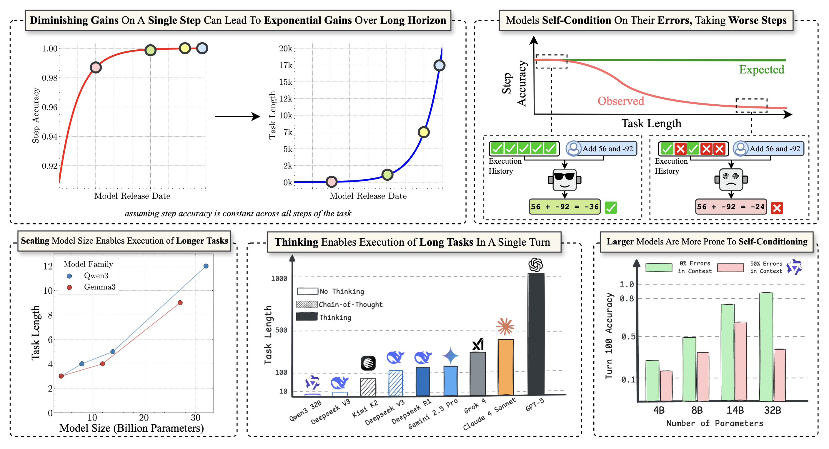 The Illusion of Diminishing Returns: Measuring Long Horizon Execution in LLMs. The authors show that scaling LLMs boosts their ability to execute longer-horizon tasks by separating execution capability from per-step accuracy and reducing harmful self-conditioning effects.