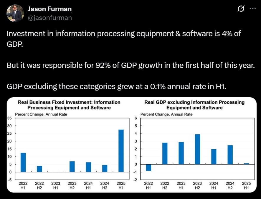 As reported by Fortune and others, U.S. GDP growth in the first half of 2025 was almost entirely driven by investment in data centers and information processing technology, according to Harvard economist Jason Furman. Excluding these technology-related categories, Furman calculated in a Sept. 27 post on X.com GDP growth would have been just 0.1% on an annualized basis, a near standstill that underlines the increasingly pivotal role of high-tech infrastructure in shaping macroeconomic outcomes.