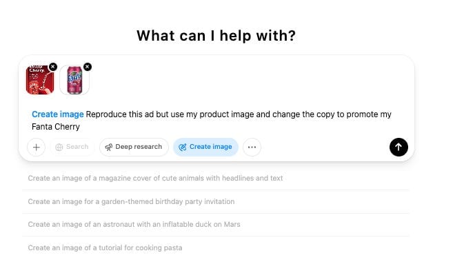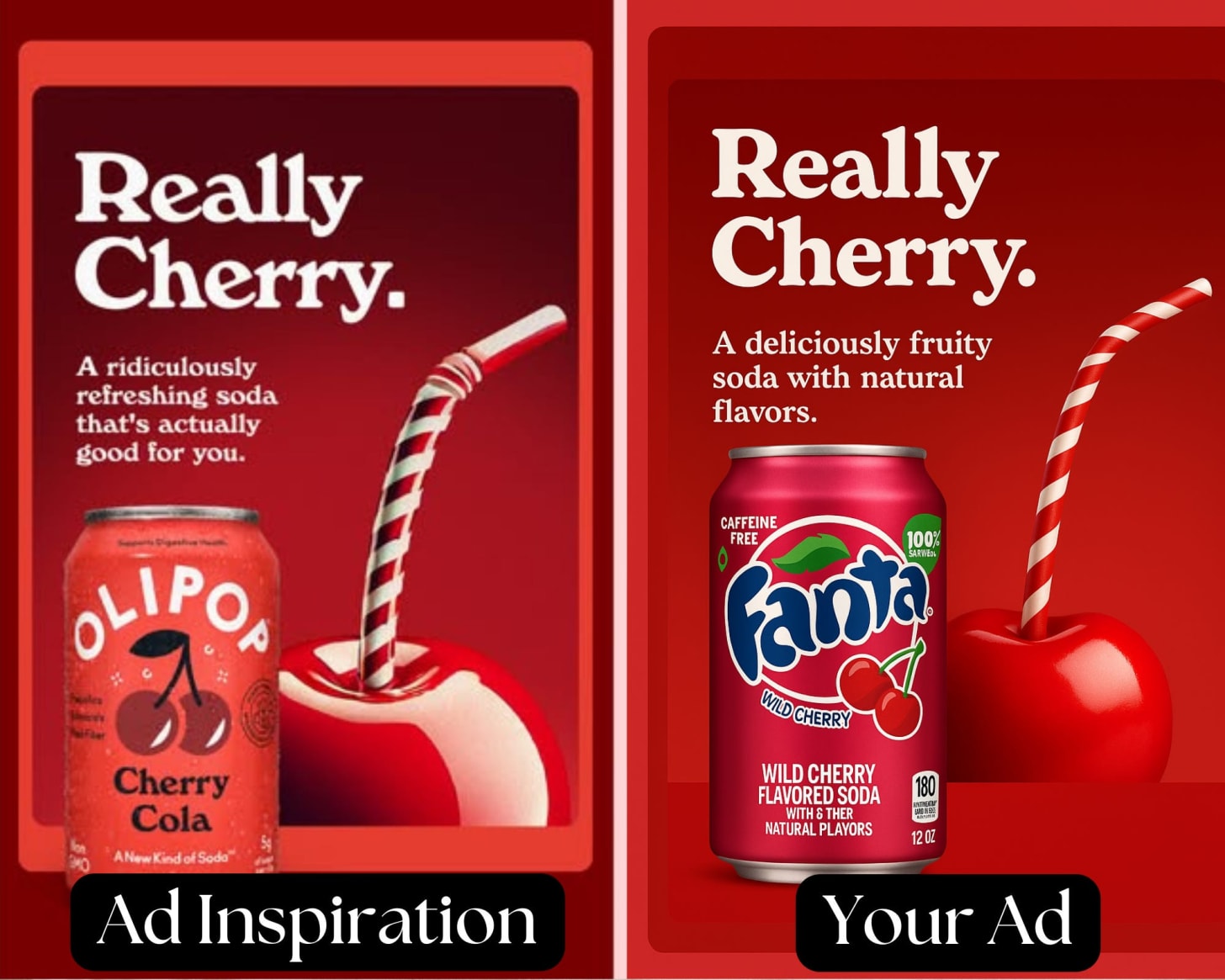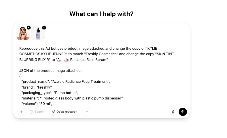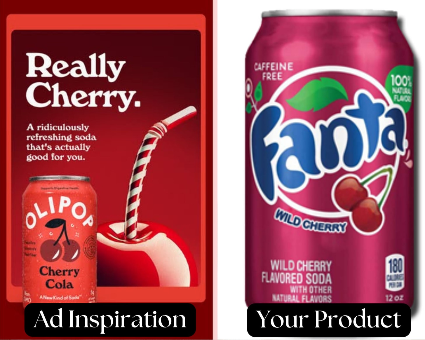 “Reproduce this ad but use my product image attached and change the copy to [INSERT COPY] to promote [YOUR PRODUCT]”