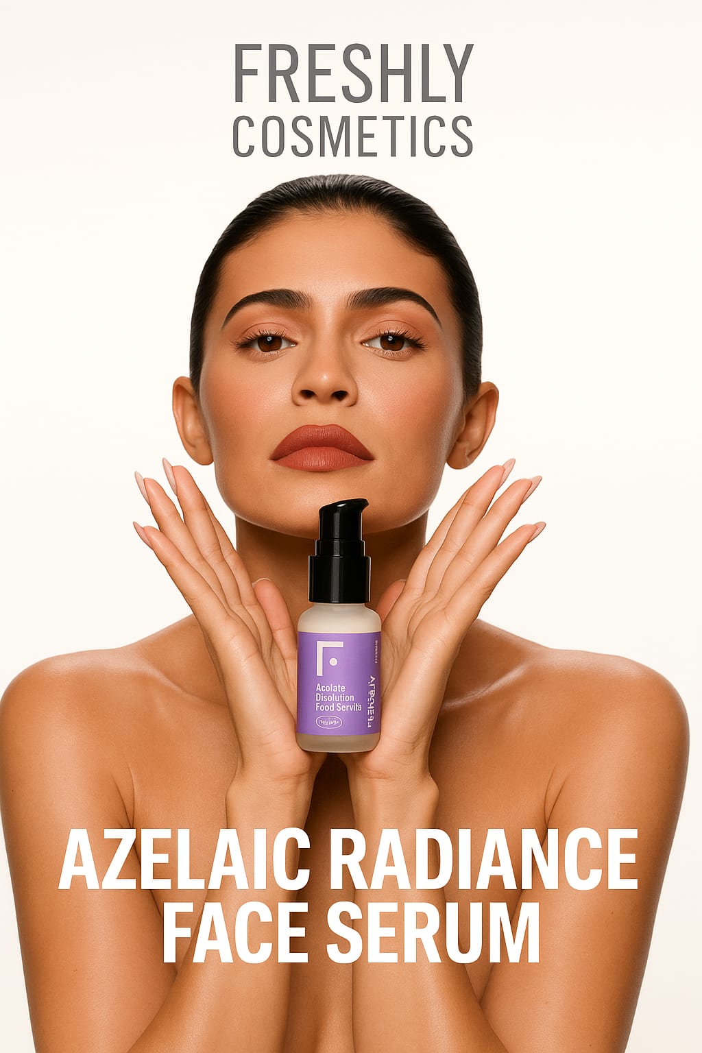 Reproduce this Ad but use product image attached,and change the copy of “KYLIE COSMETICS KYLIE JENNER” to match “Freshly Cosmetics” and change the copy “SKIN TINT BLURRING ELIXIR” to “Azelaic Radiance Face Serum” JSON of the product image attached: { “product_name”: “Azelaic Radiance Face Treatment”, “brand”: “Freshly”, “packaging_type”: “Pump bottle”, “material”: “Frosted glass body with plastic pump dispenser”, “volume”: “50 ml”, “bottle”: { “shape”: “Cylindrical”, “label”: { “primary_color”: “Lavender purple”, “accent_color”: “White”, “text_color”: “White”, “logo”: { “symbol”: “Stylized ‘F’ with dot”, “style”: “Minimalist”, “color”: “White” }, “branding_orientation”: “Vertical text for ‘Freshly’”, “elements”: [ “Azelaic Radiance Face Treatment”, “Natural Origin 100%”, “50 ml” ] }, “cap”: { “type”: “Pump”, “color”: “Glossy black”, “material”: “Plastic” } }, “angle”: “Front-facing product shot”, “lighting”: “Bright and even”, “background”: { “type”: “Solid”, “color”: “White” }, “shadow”: “Soft and minimal, under the bottle” }