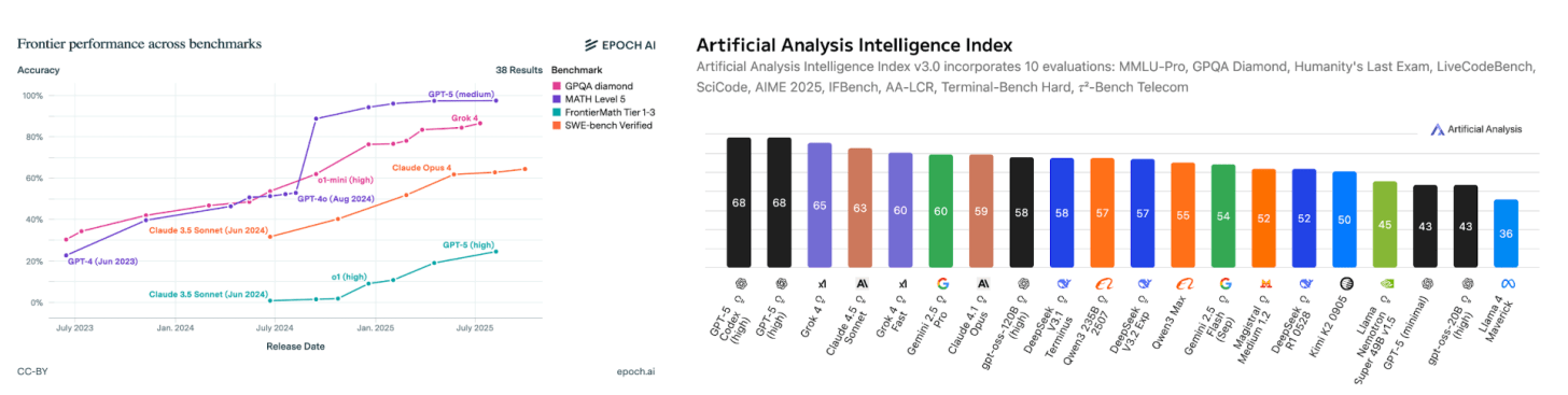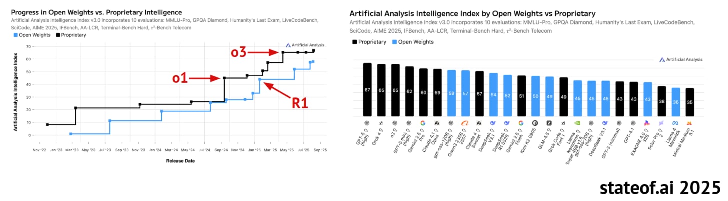 There was a brief moment around this time last year where the intelligence gap between open vs. closed models seemed to have compressed and narrow a bit. Then o1-preview dropped and the intelligence gap widened significantly until DeepSeek R1, and o3 after it. Today, the most intelligent models remain closed: GPT-5, o3, Gemini 2.5 Pro, Claude 4.1 Opus, and new entrant, Grok 4. Beside gpt-oss, the strongest open weights model is Qwen. Pictured are the aggregate Intelligence Index, which combines multiple capabilities dimensions across 10 evaluations. Also doubtful if Meta AI (likely to go closed model) or Thinking Machines and Reflection AI among other in the U.S. can catch China in open-weight models.