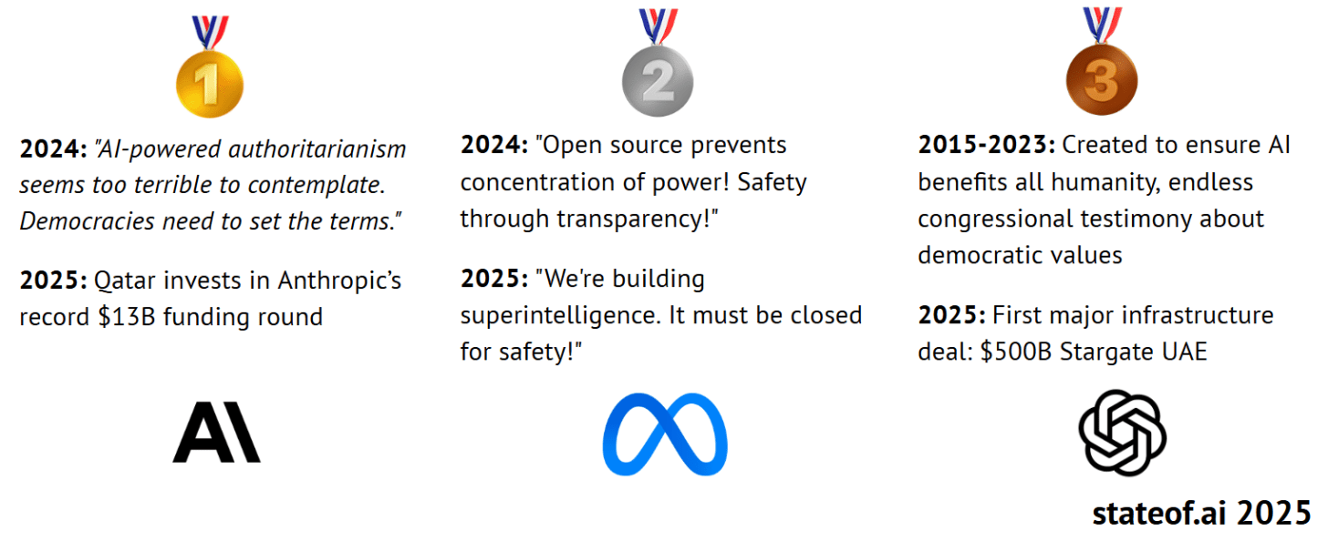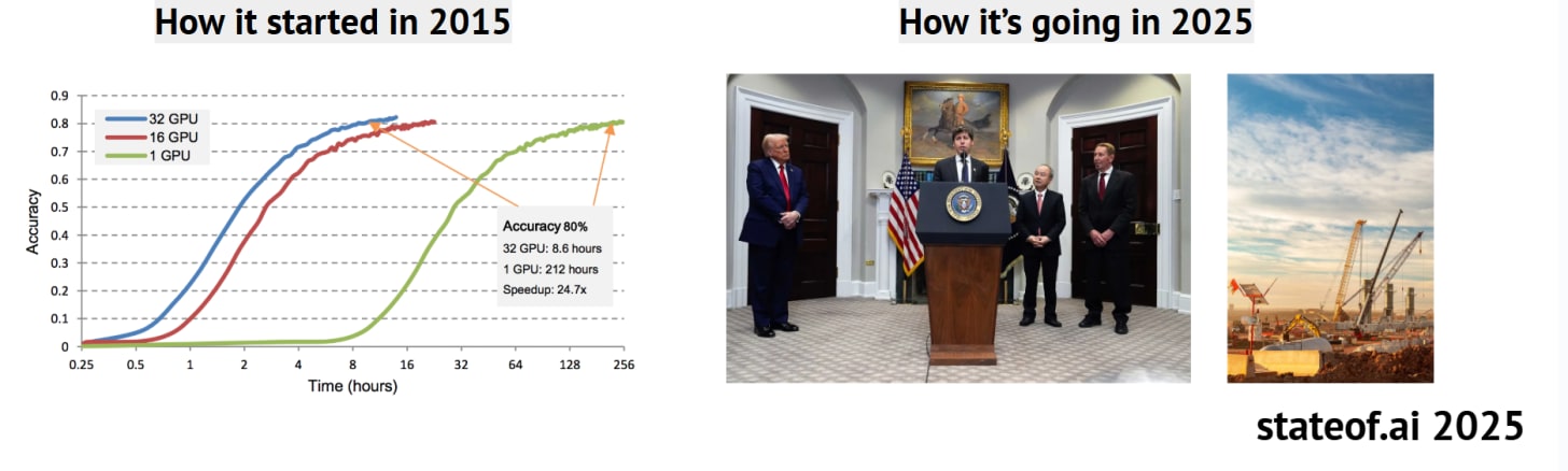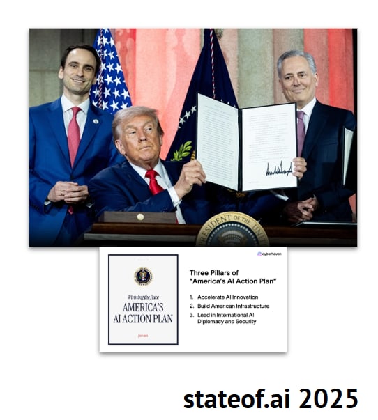 The industrial era of AI has begun. Multi-GW data centers like Stargate signal a new wave of compute infrastructure backed by sovereign funds from the U.S., UAE, and China, with power supply emerging as the new constraint. AI geopolitics is moving the needle where the U.S. has leaned (2024-2025) into āAmerica-first AI,ā Europeās AI Act stumbled, and China expanded its open-weights ecosystem and domestic silicon ambitions.