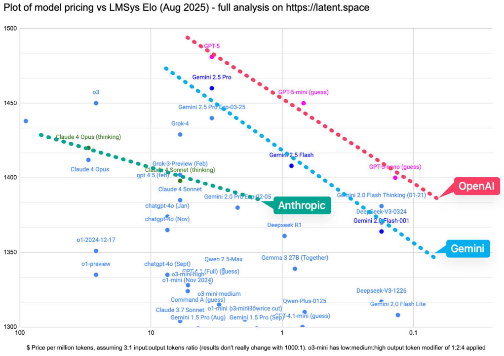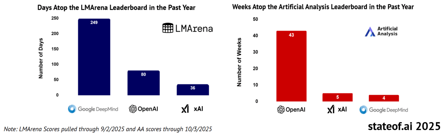 OpenAI models remain at the frontier of intelligence, but for how much longer? Anthropic models win in Coding and Google Gemini is catching up in consumer adoption.