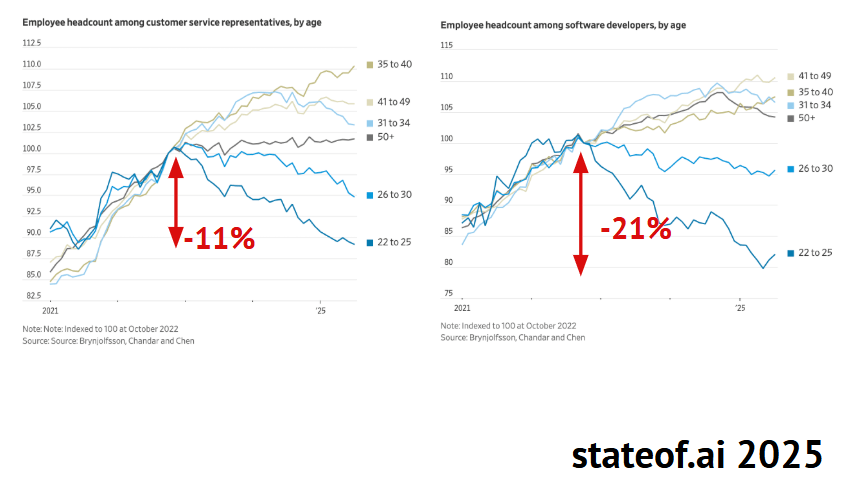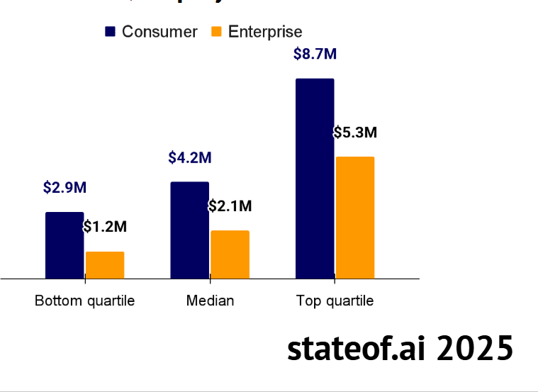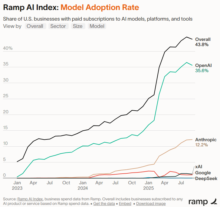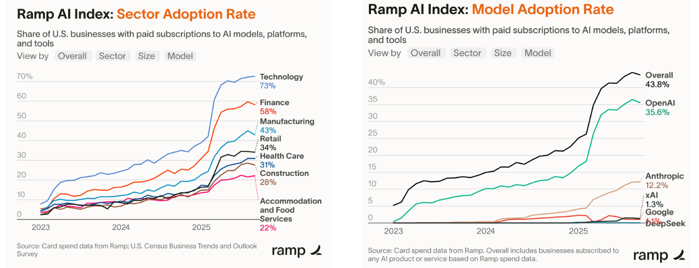 Younger companies are adopting AI more fluently with: Commercial traction accelerating sharply. Forty-four percent of U.S. businesses now pay for AI tools (up from 5% in 2023), average contracts reached $530,000, and AI-first startups grew 1.5Ć faster than peers, according to Ramp and Standard Metrics.