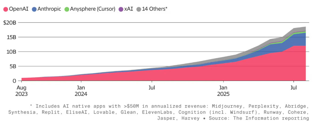 Anthropicās annualized revenue again looks poised to ~10x YoY, while the slightly more mature OpenAI appears on track to ~3x YoY.