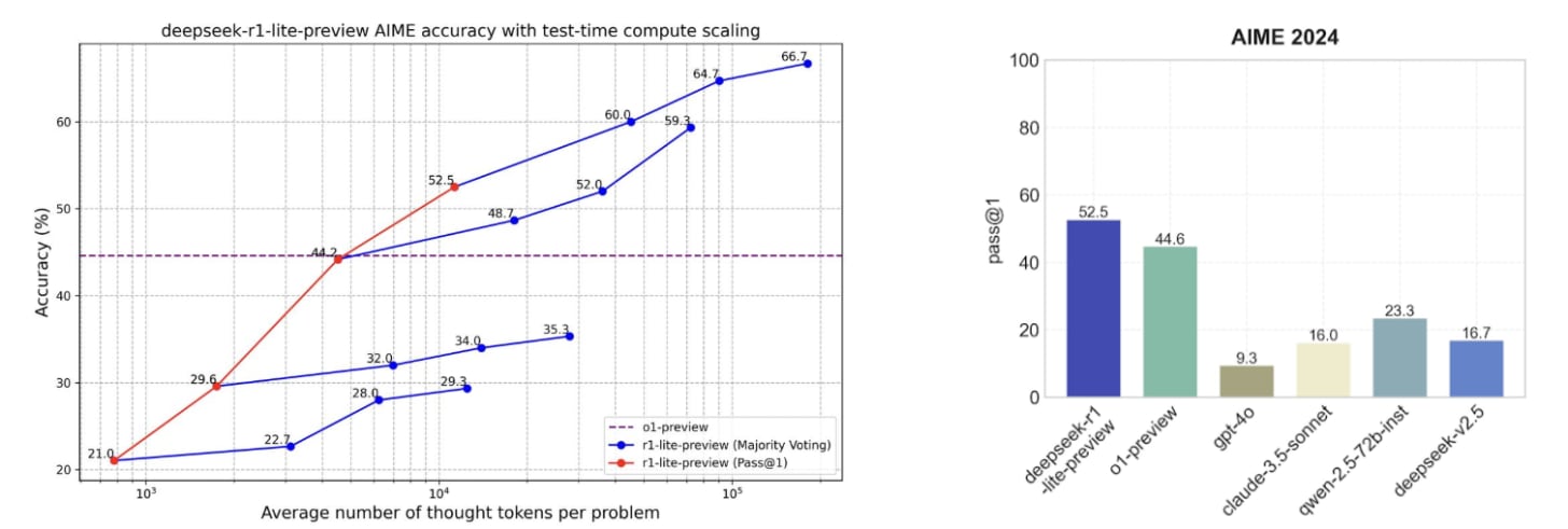 Barely 2 months after o1-preview, DeepSeek (the Chinese upstart AI lab spun out of a high-frequency quant firm) released their first reasoning model, R1-lite-preview, thatās built atop the earlier strong V2.5 base model. Like OpenAI, they showed predictable accuracy improvements on AIME with greater test-time compute budget. Note that DeepSeek-R2 is quite late (delayed) due to Huawei AI chip problems. [Awaiting Gemini 3, Grok 5, Claude Opus 4.5 and DeepSeek-R2 currently).