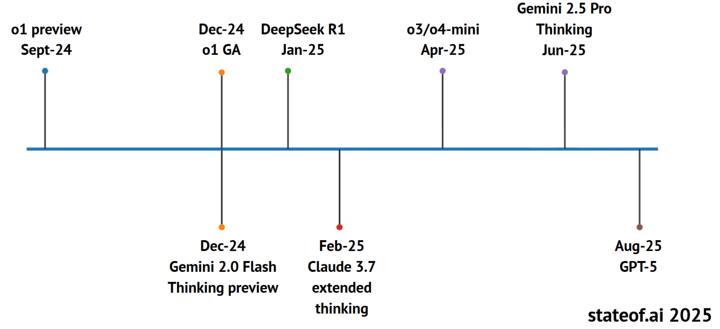 Reasoning (e.g. AI reasoning models) defined the year, as frontier labs combined reinforcement learning, rubric-based rewards, and verifiable reasoning with novel environments to create models that can plan, reflect, self-correct, and work over increasingly long time horizons.