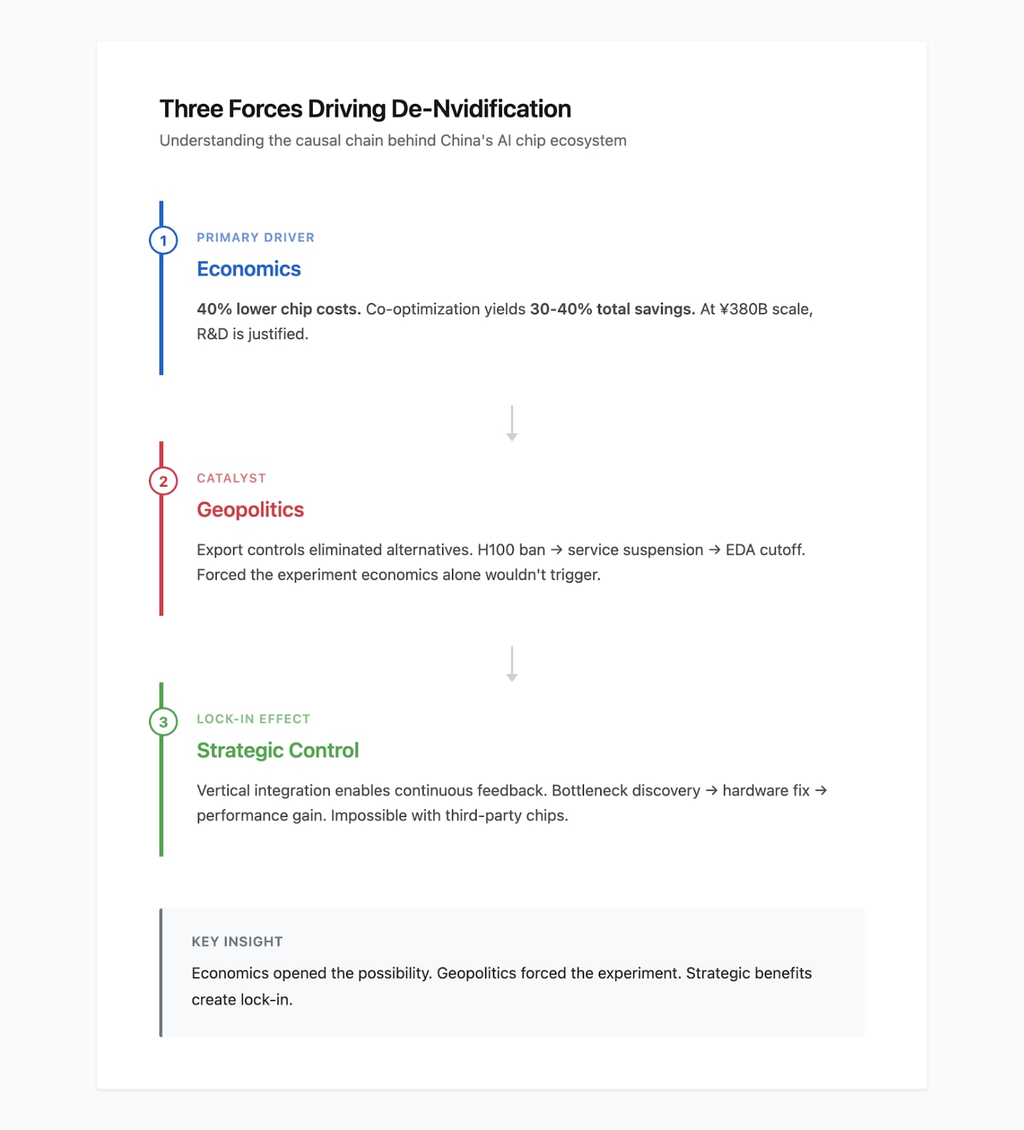 Here’s the crucial distinction: geopolitics didn’t make domestic chips economically attractive. It made experimenting with them necessary. Without export controls, most Chinese companies would have continued optimizing within Nvidia’s ecosystem. They knew alternatives might offer better long-term economics. But the disruption forced the experiment that economic logic alone wouldn’t have triggered.