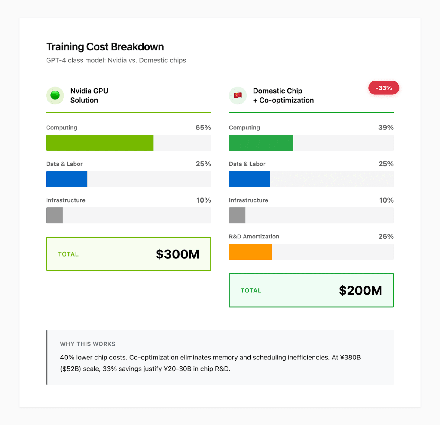 Here’s the business case. Training GPT-4-class models costs hundreds of millions of dollars. Computing represents 60-70% of those expenses. When Chinese companies evaluate switching core model training to domestic chips, they cite substantial potential cost savings–combining lower chip unit costs with software-hardware co-optimization gains–the business case becomes compelling.