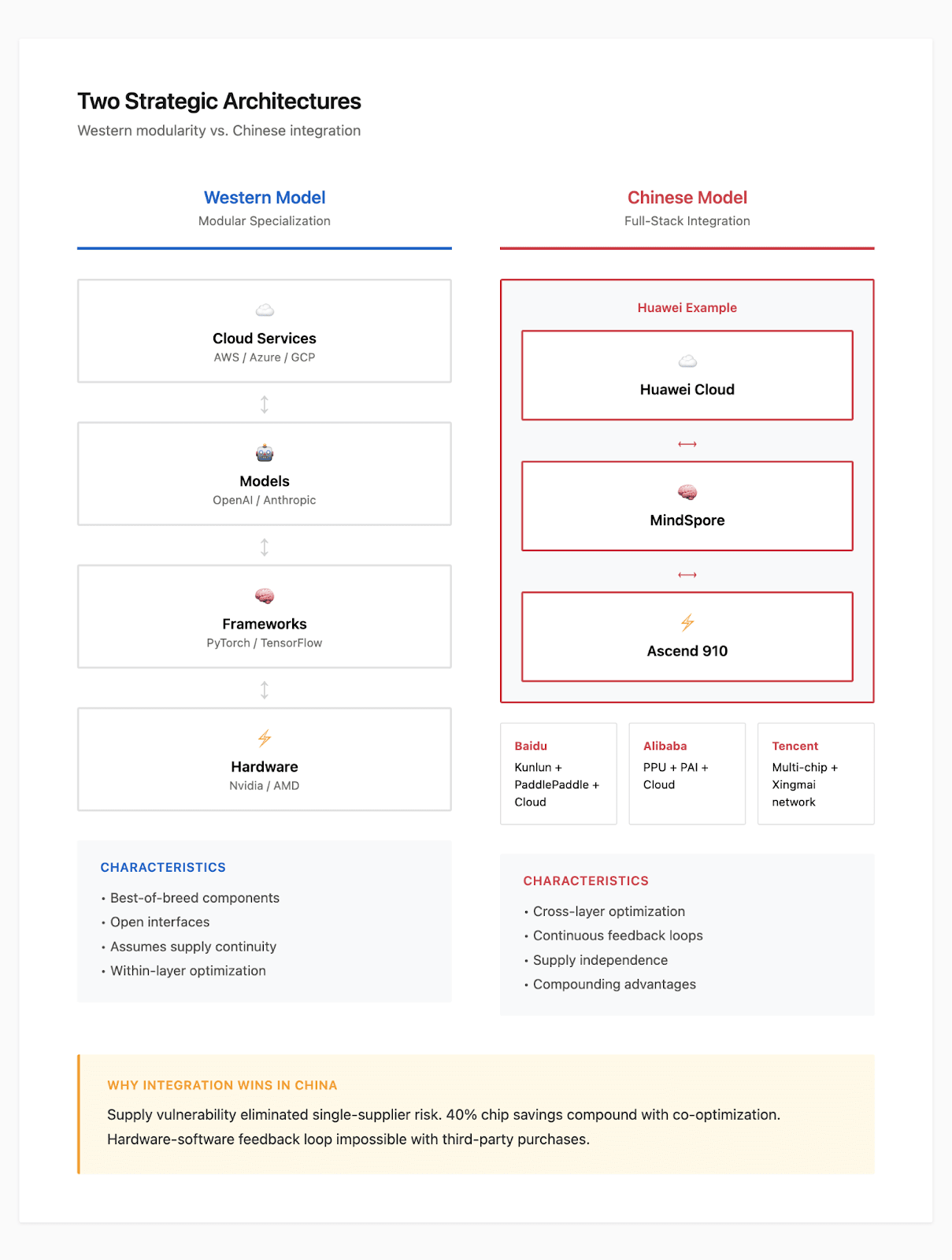 Figure 4: Two strategic architectures. Western model relies on modular collaboration with best-of-breed specialists. Chinese model pursues full-stack vertical integration driven by supply vulnerability, cost compounding, and continuous optimization advantages.