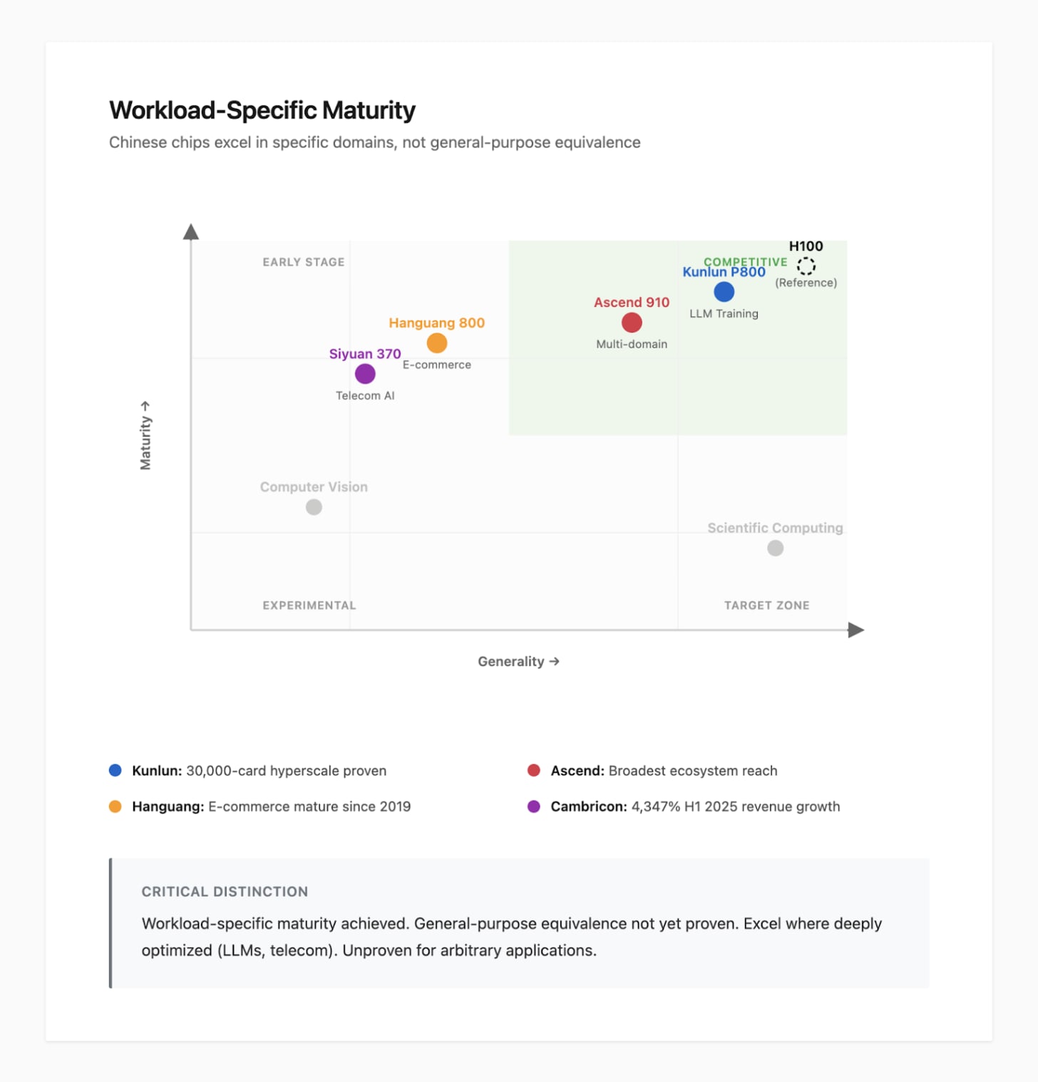 Figure 3: Workload-specific maturity landscape. Chinese chips excel in deeply optimized domains (Kunlun for LLM training, Cambricon for telecom AI) but remain unproven for general-purpose applications. This distinction separates genuine competitiveness from aspirational claims.