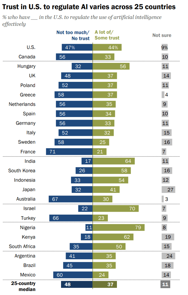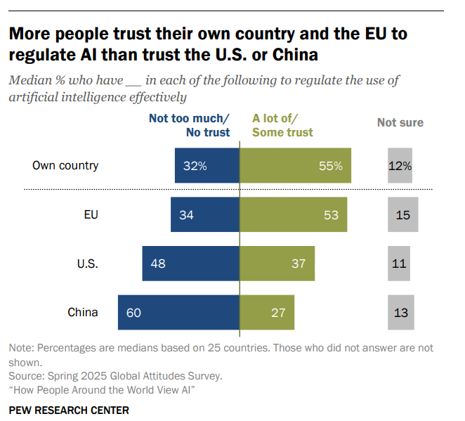 Most people say they trust their own regional country or the EU to “regulate AI” than trust the U.S. or China.