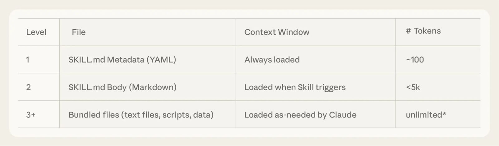 Skills work through progressive disclosure—a two-level system that keeps context efficient. The skill’s metadata (name and description) is the first level: it provides just enough information for Claude to know when each skill should be used without loading the full content. If Claude thinks the skill is relevant to the current task, it reads the complete SKILL.md file—the second level of detail. Think of it like a table of contents that lets you find the right chapter before reading the whole book.