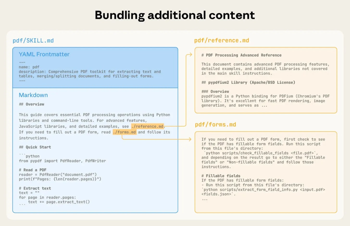 The skill packages instructions about how these formats work so Claude doesn’t have to guess.