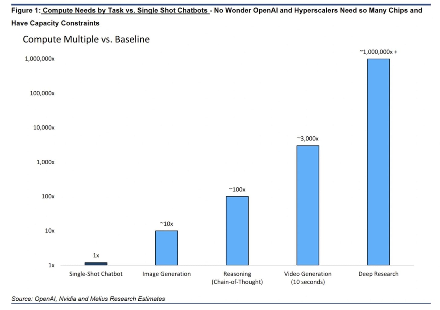 As of mid 2025, Deep Research uses 10,000X more compute than Reasoning right now. Agentic AI will use orders of magnitude more than current applications of LLMs.