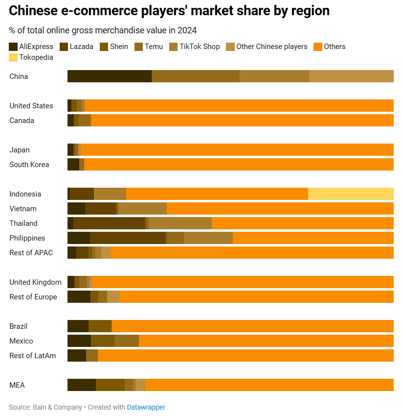 According to a CNBC article they noted that in Indonesia, Thailand and the Philippines, Chinese e-commerce players have quickly come to dominate around half of the online shopping market, Bain and Company said in a report Thursday.